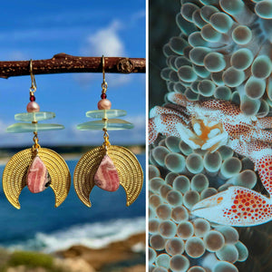 Back home, I turned that moment into these earrings: Rhodochrosite from the Andes — once believed by the Incas to be the solidified blood of kings and queens — reborn with the tiniest Indian Garnets, champagne-hued pearls and light aquatic blue recycled glass beads from the USA in a kind of tropical rebellion. They are 7cm long and set into a 22k gold -plated base from Istanbul & Seoul.