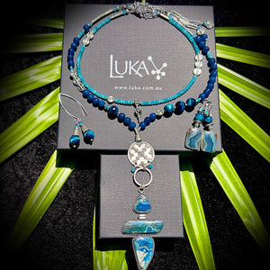 The intrigue and fascination I take from oceanic live, in its blue & green colour palette, is again the “muse” for this contemporary piece.To evoke the serenity of the ocean and the tranquility of the sky for me, I used light-blue faceted Agates in the finere inner necklace, and deep blue Agates & Tiger Eye in the outer statement necklace.