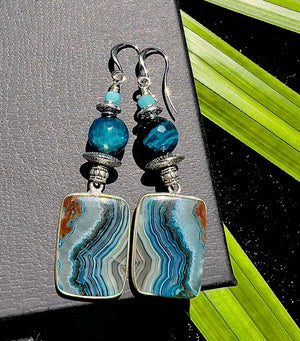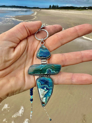 This three stone pendant is made from a Mexican Delicacy - Crazy Lace Agate from Chihuahua (set in Sterling Silver Bezels). Rarely have I come across stones of a higher quality- the banding is like an otherworldly painting, drone footage of some imaginary reef, a little geological marvel of oceanic hues photographed in the intense Australian summer sun.