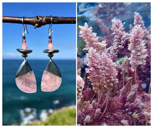 I used rose quartz and hematite intarsia for the main drop—gentle, translucent pink grounded by dark metallic edges. The small stones— opaque Peruvian pink opal, watermelon tourmaline, and garnet—reflect the subtle gradations in tone I saw in the algae, from pale to saturated. The silver elements mirror the flicker of light filtering through water.