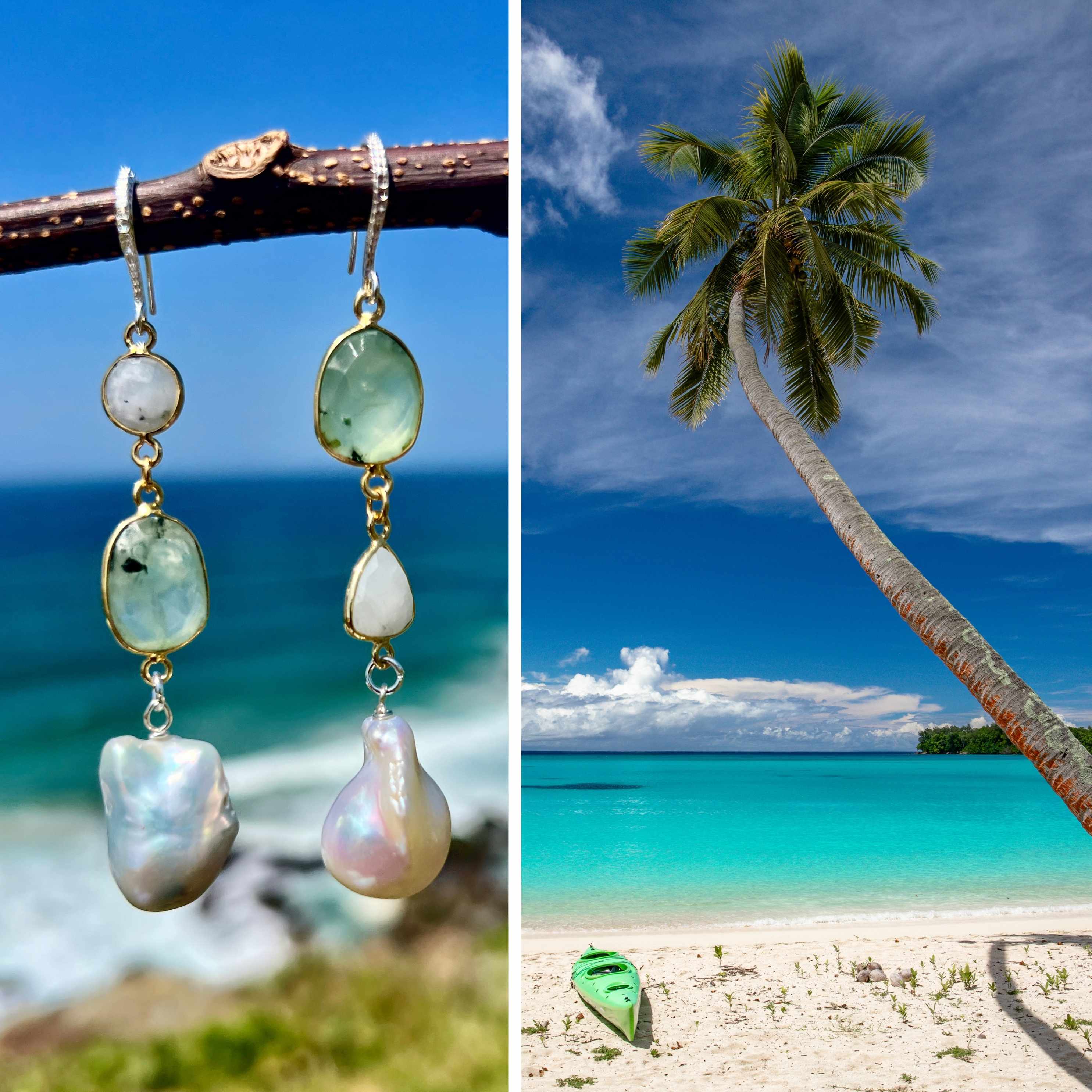 These earrings hold the calm of an ocean vista—wearable fragments of light and tide that invite the same quiet wonder as standing barefoot on a near-deserted tropical beach.