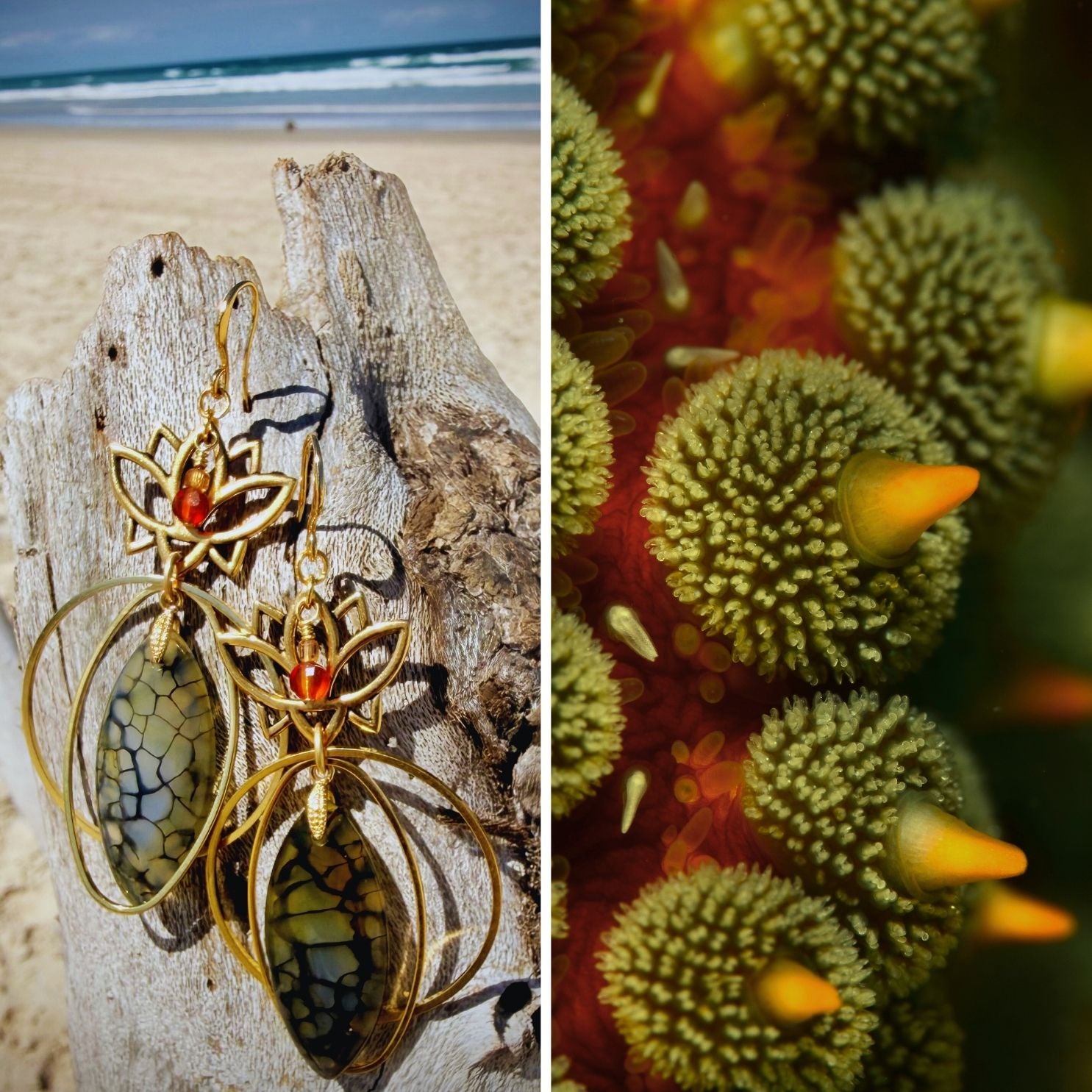 The earrings follow that visual tension with deliberate precision. Dragon vein agate from Brazil forms the dominant geometry, its fractured veining echoing the sea star’s intricate surface architecture, while hessonite and tiny chameleon accents introduce controlled flashes of orange, a sharp chromatic strike rather than ornament.