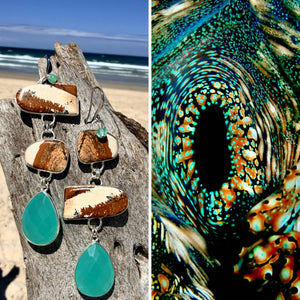That encounter became the blueprint for these earrings. Japanese landscape jasper anchors the composition with its organic, terrain-like patterning, while aqua chalcedony from India introduces a cool, luminous counterpoint. Tiny chrysoprase accents from Australia add a subtle flash of green, threading the palette together. All elements are set into a silver-plated base sourced from Seoul and Jaipur, keeping the balance crisp and contemporary.