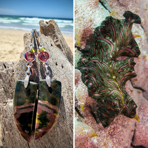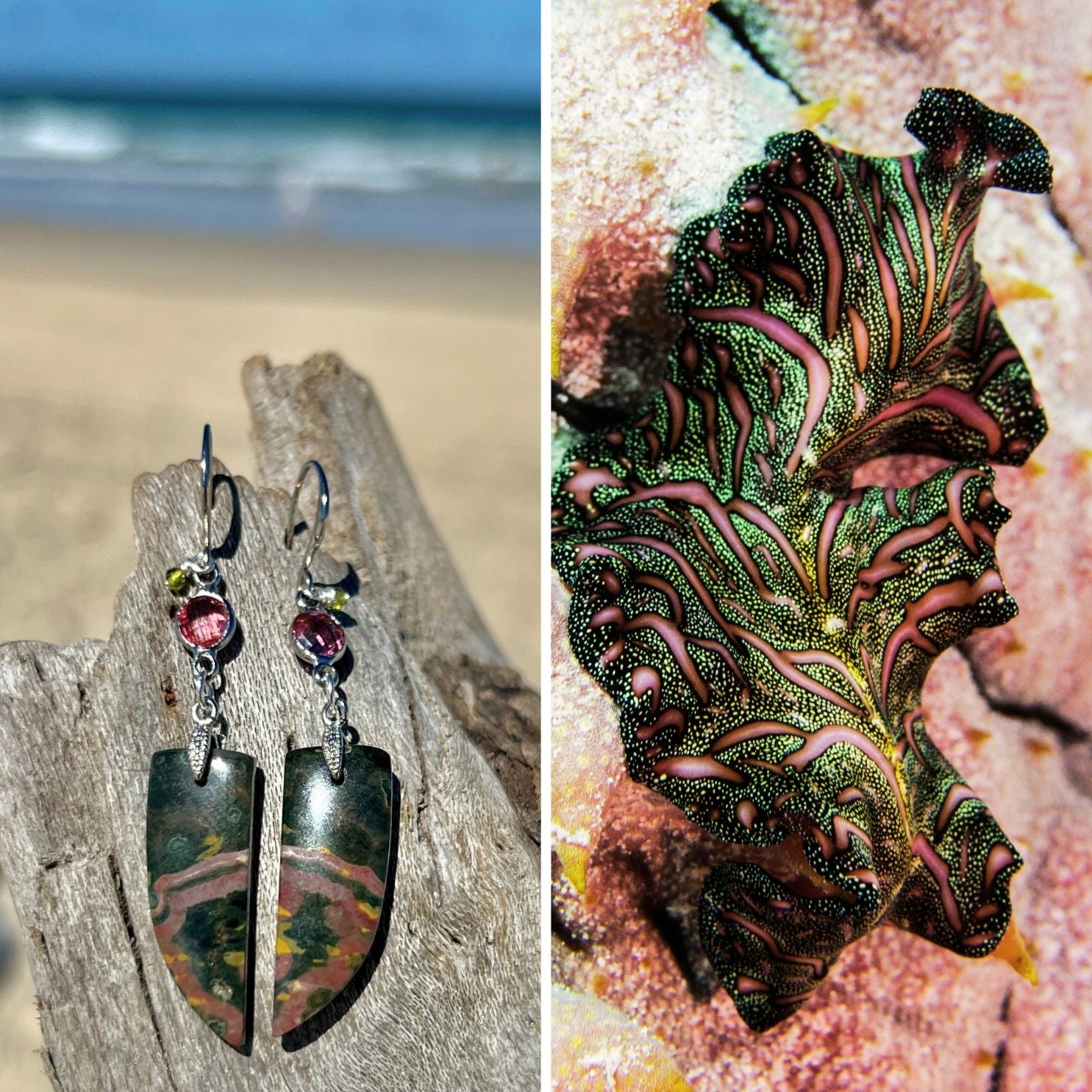 Not every underwater encounter detonates in neon. Some arrive quietly, almost politely, and still refuse to leave your mind. These earrings were sparked by one of those moments — the discovery of a rare Persian carpet flatworm, its body moving like living fabric across the reef, all muted greens, dusty rose pinks, and just a subtle flash of light.