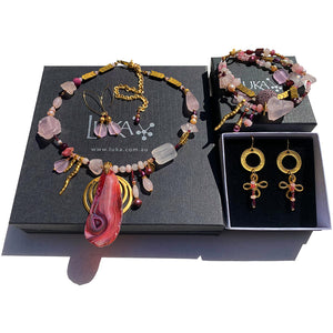 I am not quite sure if it is the “eye” of the exquisitely banded Agate or the blend of rose pastel & garnet hues that hits your eyes first. Rose Quartz (the stone of universal love), Tourmaline (considered the stone of calming energies), Garnet (the stone of self-empowerment) mixed with smooth Pearls (the birthstone of everyone born in June) - what can possibly go wrong? I just love the way the delicate rose, burgundy, pink blush & masala hues interweave to create something visually so satisfying. Merlot hued Pearls, Mother of Pearl, Lava & lots of rich warm gold Agate bead complement the gentle hues.