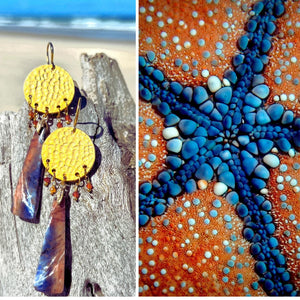 That visual ambush — rich blues colliding with warm, luminous oranges — became the structural backbone of these earrings. Hand-hammered 22-carat gold-plated discs echo the textured, studded surface, while the gentle orange & blue Namibia-blue elements slice downward like elongated reflections of that radial symmetry stretched into motion.