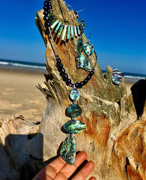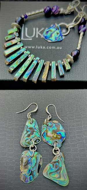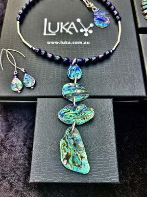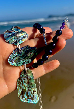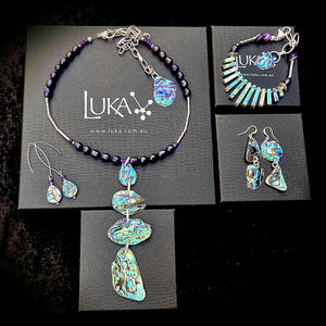 In this set I added enough midnight blue-black pearls purple Amethyst & Agates to harmonise with the lilac, purple and green hues in the Paua, complemented with a enough silver to give it a cool & calming background.