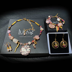 Oh I love this combination- Japanese landscape jasper in rose-chocolate-brown hues mixed with rose Quartz and shiraz-hued garnet. Chocolate & Shiraz associations … LOL- this set says a lot about me!