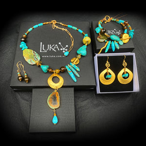Sea Sediment Jasper, Chrysoprase, Agates, Green Garnet, Howlite & Oceanic Jasper in all hues oceanic, have been combined with lots of high-end 22k gold-plated findings. It is a piece that perfectly picks up the mood on my beach (near Byron Bay) in which all the rich warm greens & turquoise of the ocean and the beach compete for your attention. It’s vivacious and it makes me feel like a day at the beach with salty skin and hair.