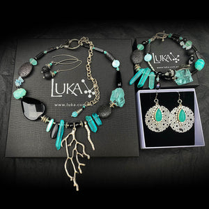 What I really love about this set is how the rough Quartz and tiny raw Aquamarine crystals bring out the smoothness of the faceted Onyx and Agates. It feels alive just like a small patch of coral reef that just “ lives” through the contrasting shapes and architecture of coral species. Oh .. and then of course there is this irresistible Amazonite-perfect day at the ocean blue-green hue married off with soothing black….can you tell I really love how this one turned out?