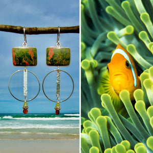Unakite born in the Unaka Mountains of the Appalachians mirrors that same shift. In strong light, the stone reveals saturated olive greens threaded with warm orange; away from the sun, those tones settle into a quieter, mossy palette. Nothing artificial — just mineral responding honestly to light. Tiny hessonite and peridot from India echo the anemonefish’s warmth, while hammered sterling silver bars from Thailand add texture and structure. Everything is held in a silver-plated framework crafted between Seoul and Jaipur, forming a lightweight 6.5-centimetre drop.
