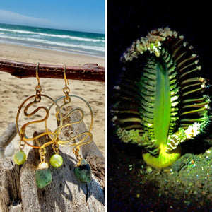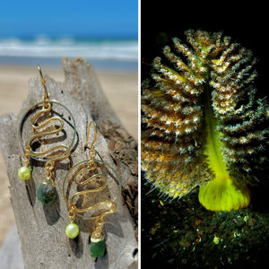 That encounter stayed with me. The elongated, gently bending lines of the colony translated naturally into form, echoed here in sculptural gold curves that refuse rigidity. Raw emerald drops carry the same saturated green intensity, their crystalline unevenness alive rather than polished into submission, while tiny lime pearls flicker like condensed luminescence.