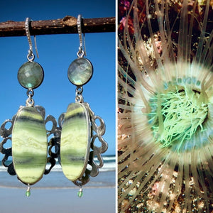 Inspired by a burrowing anemone of the same hue, the Larsonite is paired with fiery labradorite from Madagascar, flashing like heat trapped under stone, and grounded by a tiny Brazilian agate—quiet, precise, and geological to the core. Set into an antique silver-plated base, the composition balances fossil forest, living tide pool, and volcanic flash.