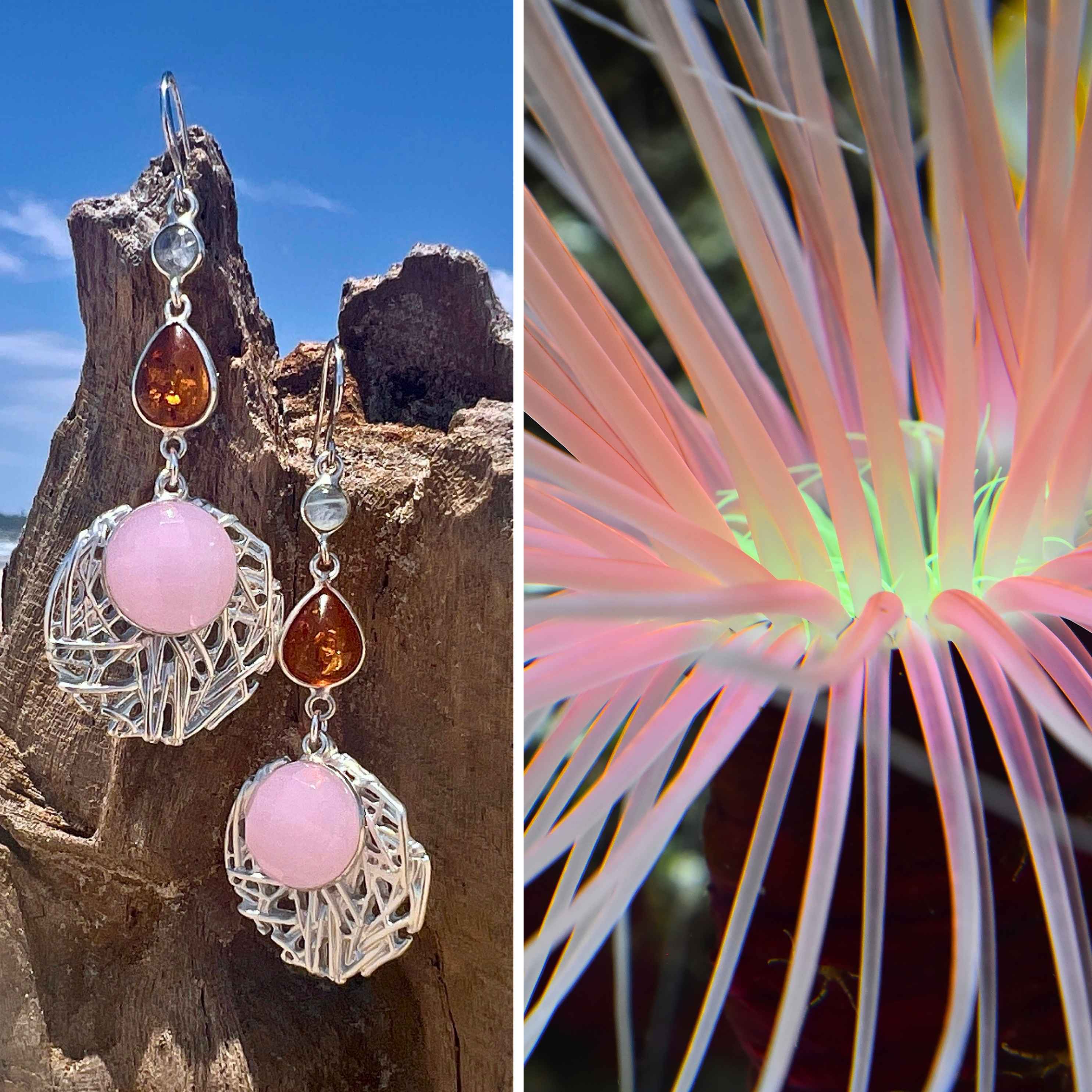 I wanted that energy — that quiet bioluminescent audacity — in jewellery. So I built these 7.2 cm earrings from faceted chalcedony from India, Baltic amber, and moonstone, set into a silver-plated base from Toronto and Seoul. The combination catches light the way an anemone catches plankton — effortlessly, greedily, beautifully.