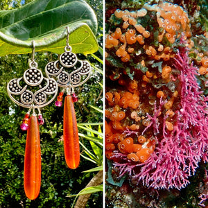 The elongated recycled glass beads, in warm orange, echo the upright tubular bodies of the ascidians.Tiny carnelians, tourmaline, and garnet, their brilliance recalling the flashes of pigment that catch the eye when snorkelling across such assemblages, complete the feel-good stone assemblage.