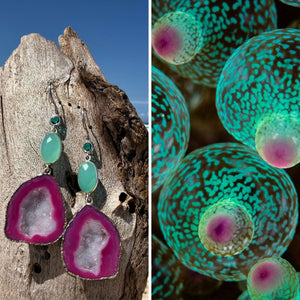 Some underwater scenes are so exquisite, they feel like hallucinations. Off Komodo, I once drifted over a bubble anemone that looked like a living galaxy — milky blue-green spheres tipped with magenta light, swaying like thoughts you can’t quite hold. These earrings are that dream, bottled.