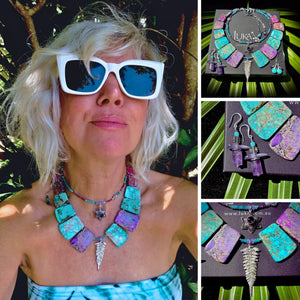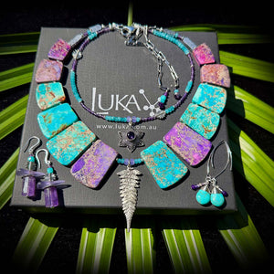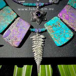 That spectrum flowed straight into the outer necklace, built from large slabs of turquoise–lavender sea-sediment jasper, streaked with earthy creams, and laced with tiny Brazilian agates. The silver-plated hematite chevrons give it a clean architectural edge. Its focal point, a detailed silver fern, nods to the natural world with a 1920s Art Deco sensibility.