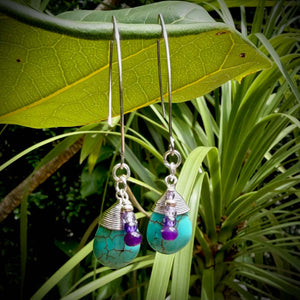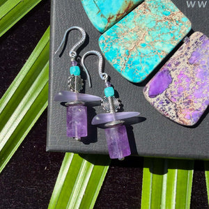 Two earring options complete the set: a long, elegant pair with turquoise drops and amethyst stacks for quieter days, and a bolder pair with Uruguayan amethyst barrels, recycled-glass shards, and Peruvian amazonite for when subtlety feels optional (5.3cm long).
