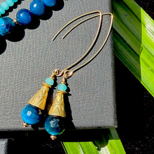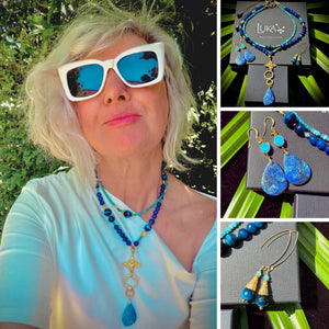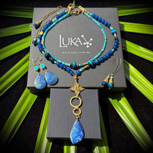 The outer necklace carries a chrysocolla pendant suspended from a gold-plated ring, its tail of charms and Brazilian agates moving like light on shallow sand. The inner necklace tightens the rhythm: tiny agates in shifting blues, tiger eye for warmth, all set into a 22k gold-plated base.