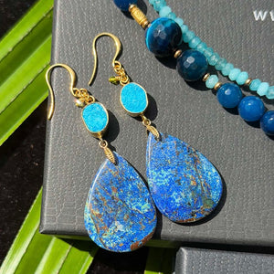 Two earring moods: a sleek, elongated pair on French ear wires—effortless, neck-lengthening—and the statement pair, 6.8 cm of chrysocolla and raw turquoise that feel like tectonic plates in gemstone form.