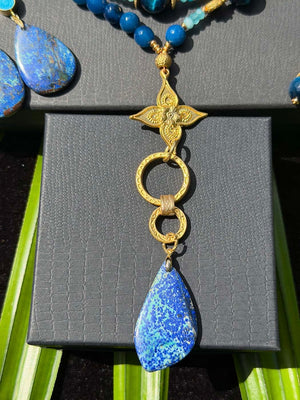 This set is what happens when colour biology, coral-reef memory, and the raw physics of copper collide. Chrysocolla—the kind that only Congo seems able to dream up—anchors everything here. Those slabs and beads carry that impossible, oxygen-rich blue that psychologists say we’re wired to chase: the ultramarine humans evolved to trust because it meant water, depth, survival. The stones are mottled with green, like aerial reef shelves interrupted by sudden drop-offs, that kind of chromatic tension only nature manages without trying.