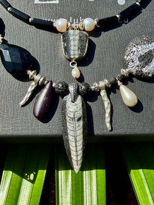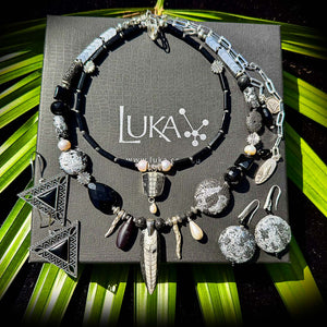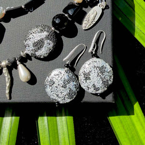 A centrepiece this commanding asks for restraint, so I kept the palette monochrome: black-on-black onyx, lava, tourmaline, and agates, anchored by cool silver. But the real labour of love lies in the beads that shimmer quietly: I hand-silver-gilded each lava bead, a painstaking process. Lava is porous, unpredictable, and stubborn; the silver leaf must be coaxed onto its surface fragment by fragment. It’s the same delicate technique Klimt used—except executed on volcanic stone, turning matte black into tiny cosmic globes with imagined continents.