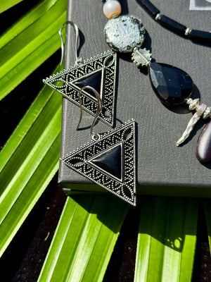 Two necklaces shift between lives—stacked, solo, or linked for mid or long lengths. The earrings echo the theme: feather-light silver-gilded lava discs (5.2 cm) and minimalist triangular onyx pairs (5.8cm long).