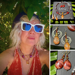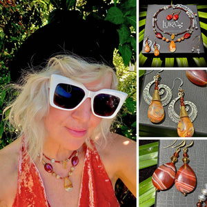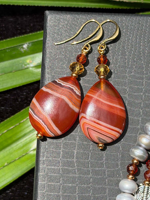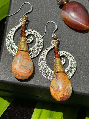 Three earring moods echo the range: burnt-orange sardonyx teardrops for simplicity; a sleek long-wire pair with silver pearls and hessonite; and the 6.3 cm statement pair—Chihuahua Crazy Lace Agate set with faceted hessonite in a sculpted swirl.