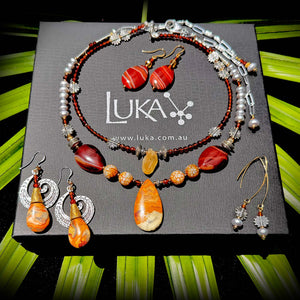 This set works entirely on the physics of warm colour. Mexican Crazy Lace Agate brings the full tangerine–mustard spectrum, the kind of saturation that colour theorists point to when they talk about “heat within a hue.” Dragon Vein Agate amplifies it with its own mustard striations, and the sardonyx teardrops add that deep burnt-orange drop shadow that makes the whole palette feel dimensional rather than loud. Silver pearls and the silver-plated base act as the cooldown—neutral reflectors that stop all that warmth from tipping into maximalism.