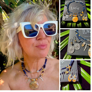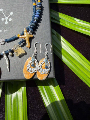 The earrings on the right were inspired by the intricate textures of the reef edges—the little hidden worlds tucked between boulders (7.3cm long). The Maliagano Jasper ovals show off those same warm sand-and-coral tones, layered and soft but unpolished. They’re topped with tiny Dumortierite and Kyanite elements, referencing the deepening blue of the ocean just beyond the reef.