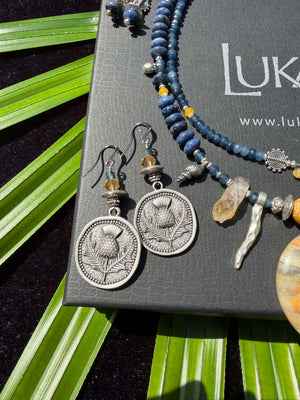 There are 3 pairs of earrings  to choose from depending on your mood: An intricate silver thistle pair with tiny Citrine and Agate elements ( 5.7cm long).