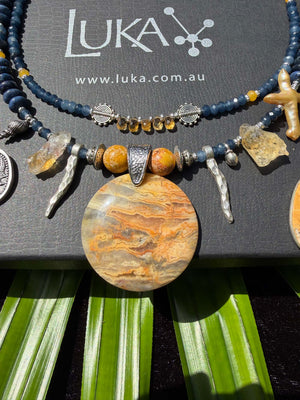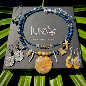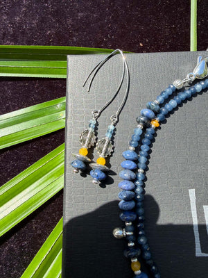 Against it, the blues pull the set into balance. Dumortierite from Sri Lanka gives a midnight-toned backbone; tiny blue Brazilian agates sharpen the transitions; and sea sediment jasper threads the line between earth and ocean.