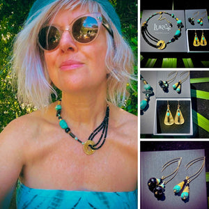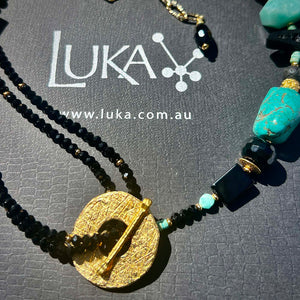 The gold circular pendant with its textural divide is the focal point—it reminds me of moonlight filtered through your mask at depth. It’s structured, almost ceremonial. And the subtle asymmetry of the design—clusters of turquoise and black set off-centre—feels like how reef formations aren’t perfect, but they’re balanced in their own wild logic.