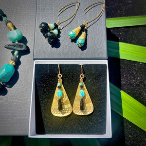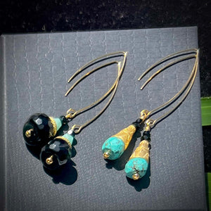 • The gold teardrop pair with turquoise and black onyx accents (bottom right; 6.2cm long ) match the necklace’s pendant like a well-timed buddy check. They're formal without being fussy, shaped like falling water or the silhouette of a descending diver.