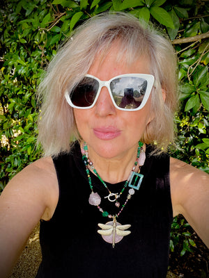 The rest of the necklace builds that feeling out through rose quartz, African Turquoise, Agates, Chrysocolla, Pearls  and irregular glass beads that reflect the scattered beauty of floating algae mats, glints of fish scale, and shifting currents.