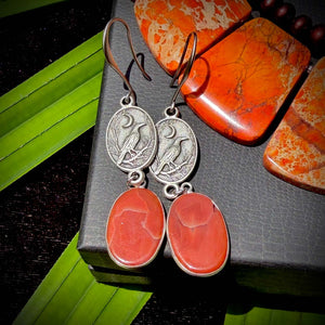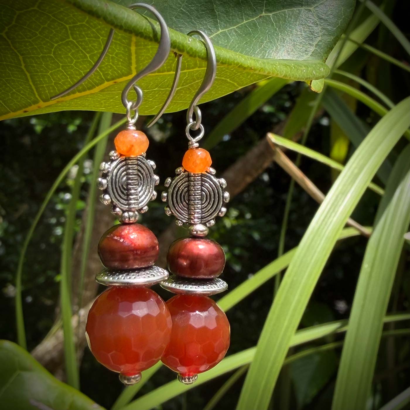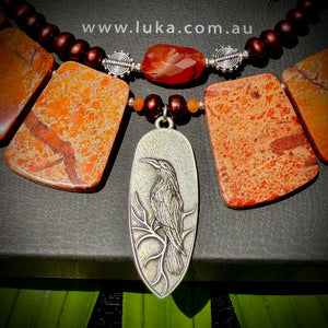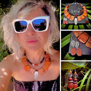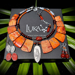 The larger necklace is built around fossilised sea-sediment jasper slabs, those impossible volcanic oranges that look like magma paused mid-cooling. Each slab has its own internal map of fractures and sediment, and I anchored the heat with deep chocolate pearls to give the palette weight.
