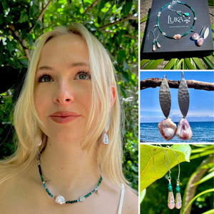 To honor the request for simplicity, each necklace centers a single statement pearl, supported by agates and gemstones chosen for subtle strength rather than drama. And yes—they look stunning on younger women too. My daughter reluctantly modeled them, proving big pearls truly are universally loved.
