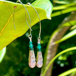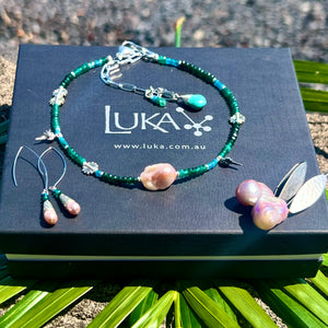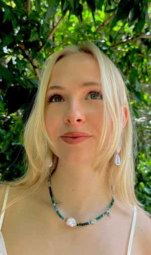 The necklace leads with a luminous baroque pearl, bracketed by ombré Brazilian agates shifting from deep forest to bottle green, plus tiny Indian apatite cubes that add a crisp flash of blue-green. Silver-plated elements keep the tone cool, and a few of my favourite murex-snail casts slip in as subtle, sculptural marine surprises.