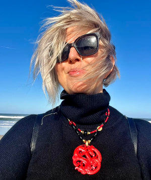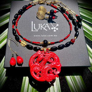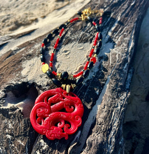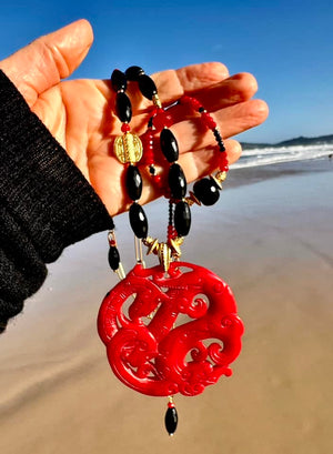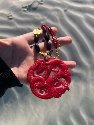 My latest acquisition is a carved red jade centre piece on a necklace that links with it gold, black and red partner to form the most stunning statement piece to finish any outfit.