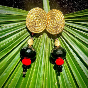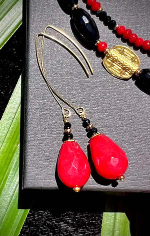 Many years ago, I brought back a whole lot of carved Jade pieces from Singapore that were carved by a master carver ( I am ashamed to say I lost the certificate that came with each pendant stone).  And so finally, this red stunner finally found its perfect little black companions in form of Agates, Onyx & Spinel.  You can wear the necklaces separately, layer them or connect them for a mid or long necklace depending on your mood.