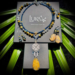 This one-of-a-kind statement set is made from the following semi-precious stones and findings: