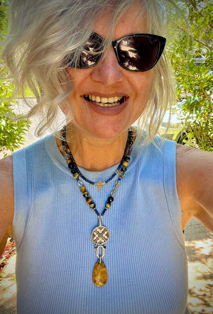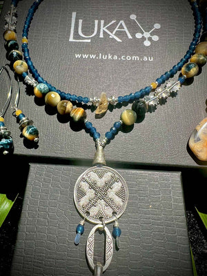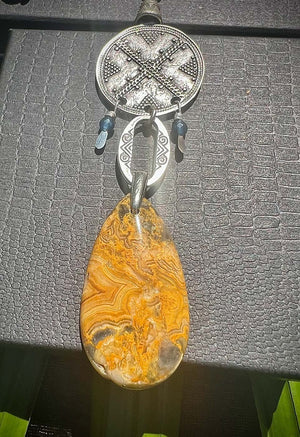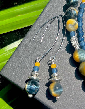 Combining Brazilian dark blue Agate beads with Mexican warm dark yellow Crazy Lace Agate beads in a silver necklace creates a stunning contrast of colours and textures that enhances the beauty of each stone- at least for me!