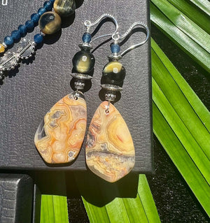 I feel the deep, cool blue tones of the Brazilian Agate evoke a sense of calm while the earthy mustard hues of the crazy lace agate bring the warmth to the relationship. The intricate swirls of yellow, orange, and tan in the Mexican stone seem almost to dance beside the stillness of the blue agate- if that does make any sense to you!