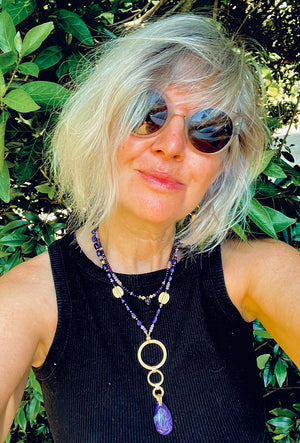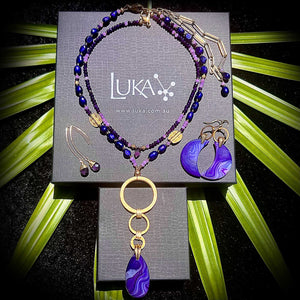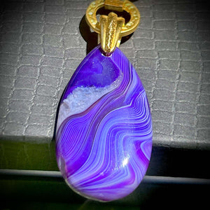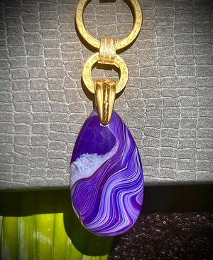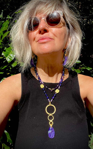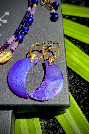 The focal point of this set is a teardrop pendant made of an exquisitely banded purple Agate, whose intricate patterns and deep purple hues exude a majestic quality (Hello, Queen!). To elevate the design, I’ve added 22k gold-plated beads, infusing a warm and radiant glow that brings the necklace to life.