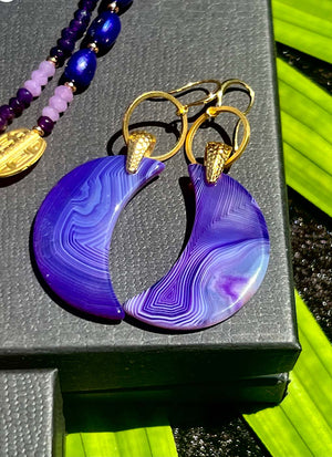 The contemporary & subtle statement earrings are coming to life through the minimalism of exquisitely banded Agate half moons in the deep purple spectrum, complemented with tiny Agates. Set into 22k gold-plated hoops from Istanbul  while the bails are from the US and the ear wires from Seoul (6.6cm long). I have rarely seen Agates of a higher quality, but if you can only handle very light-weight earrings these are not for you .