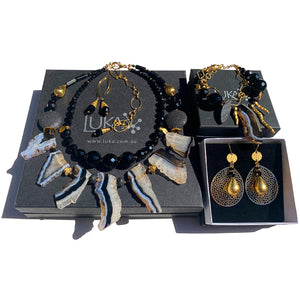 I am a serious stone horder - and it is not uncommon that I hold onto stones for many years before I feel I have found their perfect partners. These Botswana Lace Agate slabs have been living a quiet life in my studio for a decade, but now they are ready to start their new life. I kept the rest of the set very simple with Onyx, Lava & Agates & plenty of 22k gold-plated pieces, because the stars really are the Botswana Lace Agate slabs and they don't need any competition!