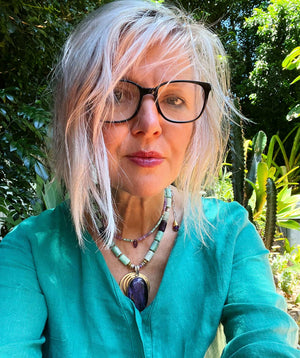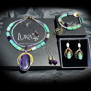 A massive Siberian Charoite, Amethyst, Amazonite, Agates and tiny Hubei Turquoise rondelle beads set into a gold & silver- plated base- brought to life by the Australian summer sun.