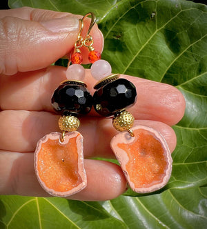 The statement earrings feature earthy orange Agate geodes with the mesmerizing patterns and hues found in these unique gemstones from Jaipur, India.  For me, the Agate geodes add a touch of organic elegance & vivaciousness, with their natural, irregular shapes and crystalline interiors.