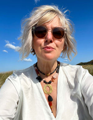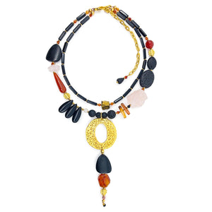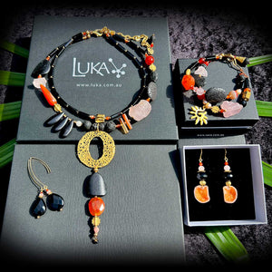 This contemporary set “breathes” a warm energetic exuberance, mainly through the brilliant orange of Carnelian & Agates and Rose Quartz and contrasted by black Onyx, Lava, Bone & Tourmaline. Just like the unexpected fire of a sunset, or the first flash of autumn leaf brilliance, Carnelian really has the power to captivate the wearer. The ancient Egyptians called Carnelian “the setting sun” and to this day it is believed that Carnelian brings great motivation, passion, and sense of happiness to the wearer.