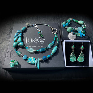 Azurite, Turquoise, Amazonite, Agates, Apatite, Jasper, Pearls, Howlite  & recycled glass beads all come together in the oceanic set.